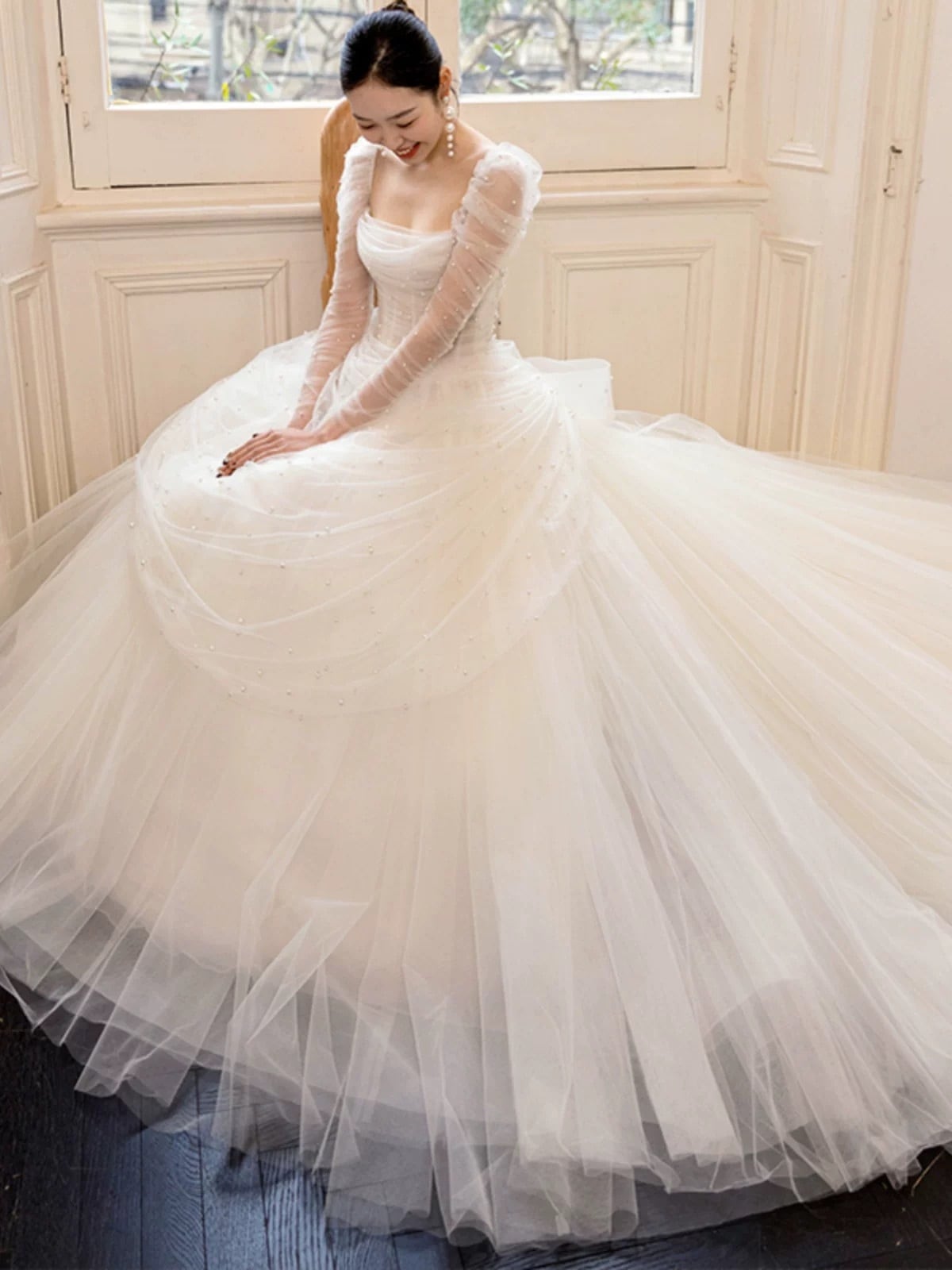 韓国風ふわ花ドレスブルーベール付き