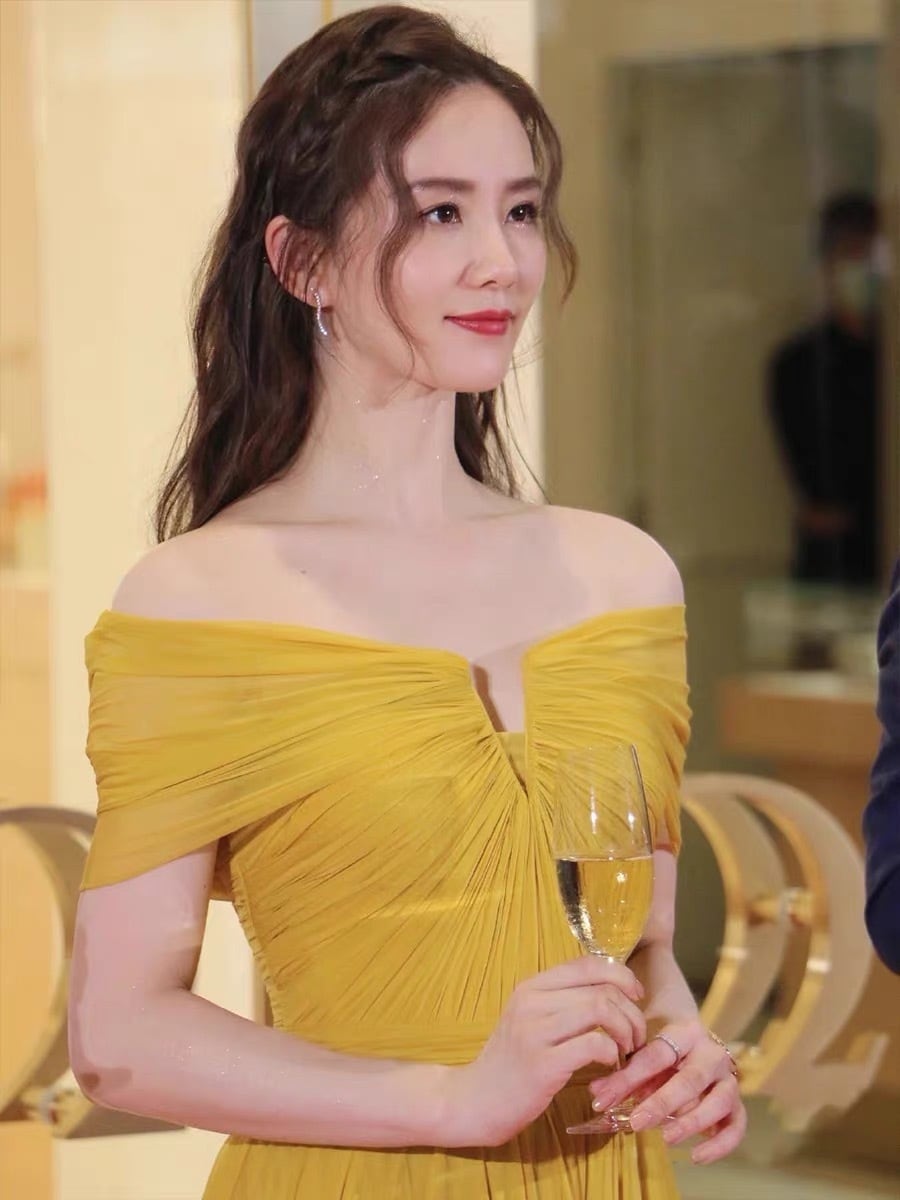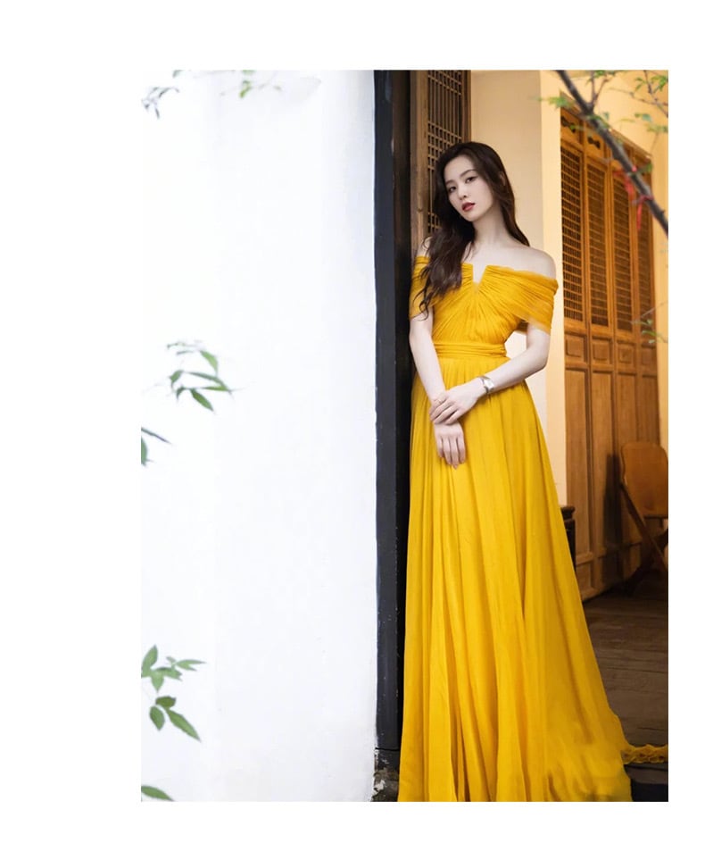 モードカラー:オフショルダーシフォンドレスマスタードイエロー