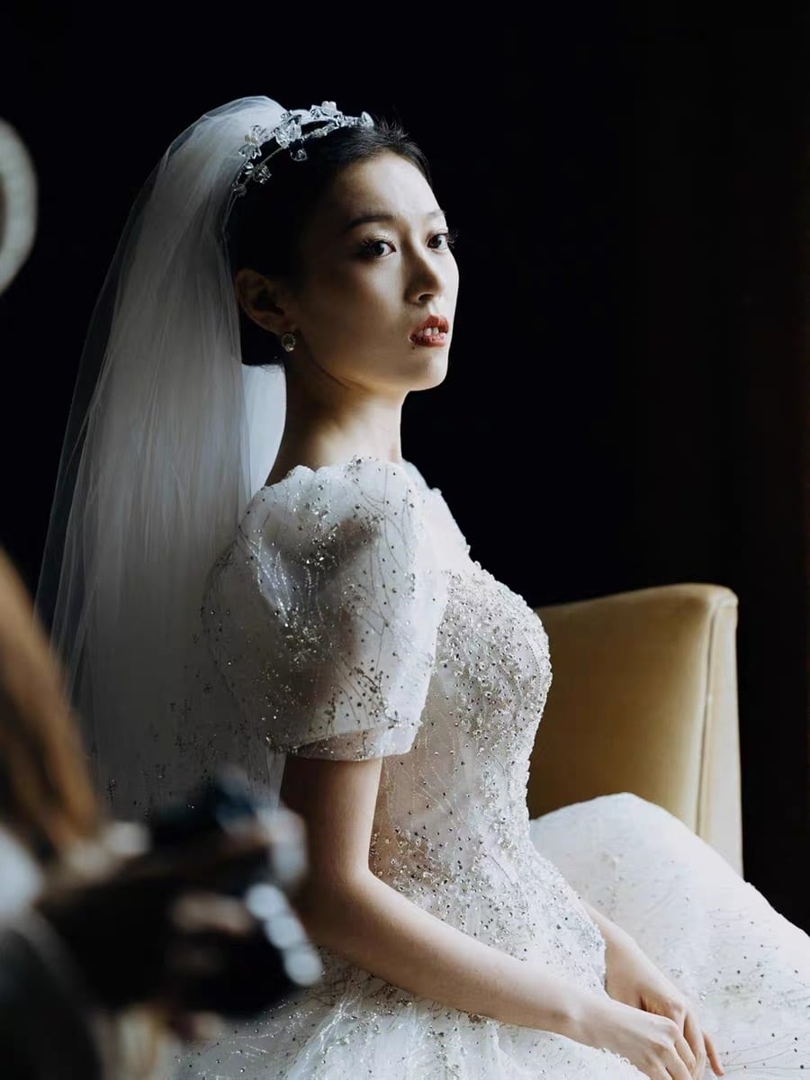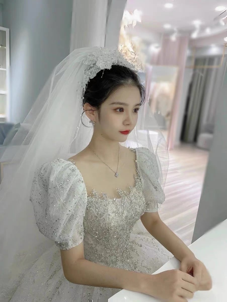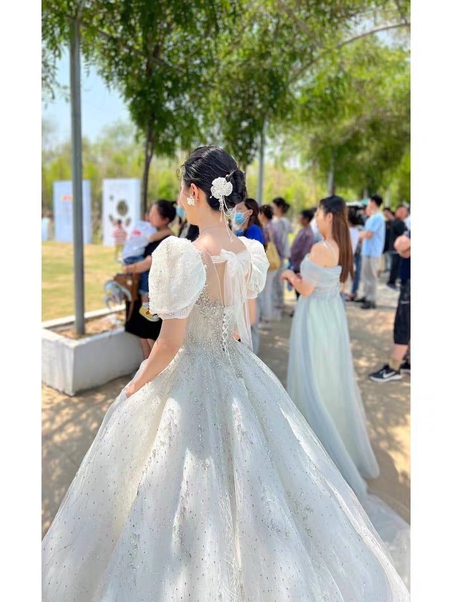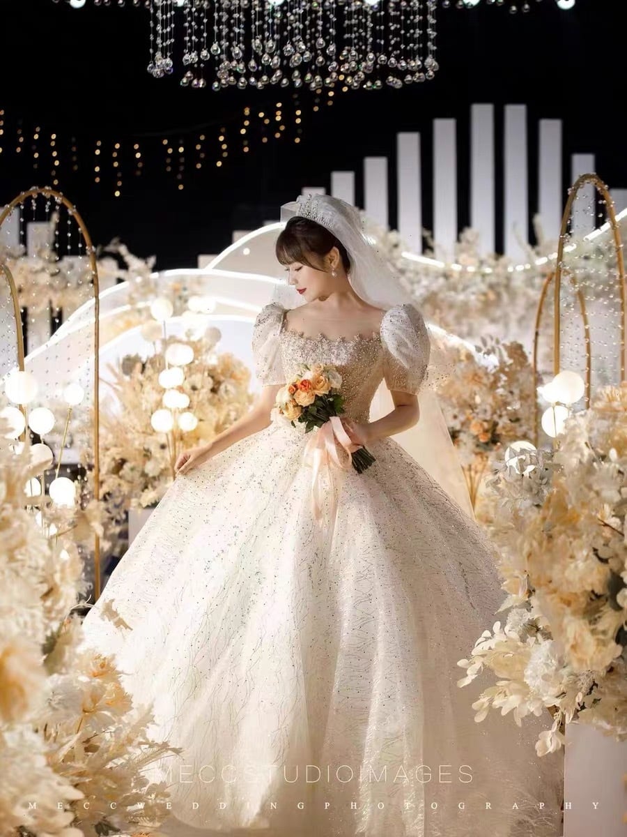 韓国風豪華ドレス:パフスリーブ刺繍ドレス